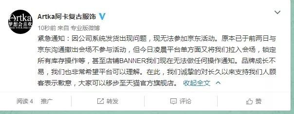裂帛还在声明中强调,从6月2日,京东擅自锁死了裂帛旗舰店所有功能包括库存、价格、页面等,这导致了超卖现象发生,并且强行将裂帛放入会场并强施加由商家承担的3.8折优惠券,导致其巨额损失。“为防止更加巨大的损失发生,裂帛不得不提出关闭京东旗舰店的决定。”