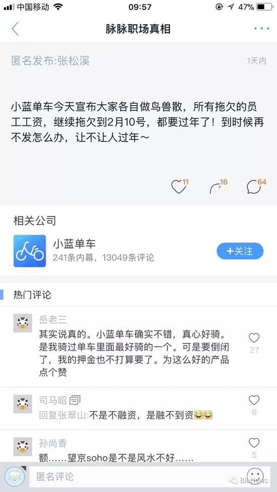 今日,有小蓝单车员工在某职场社交平台发布消息称,小蓝单车宣布解散,拖欠员工工资继续拖欠至2018年2月10日。小蓝单车HR昨天开始已在朋友圈卖办公家具。